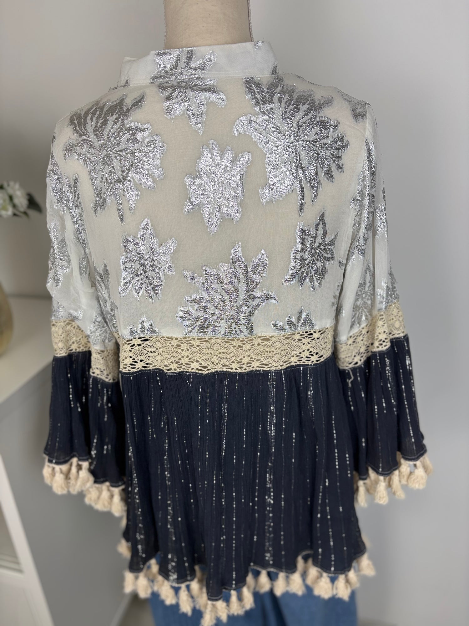 Pecho con estampado en plata y cuerpo con vuelo en negro y acabado en borlas.
