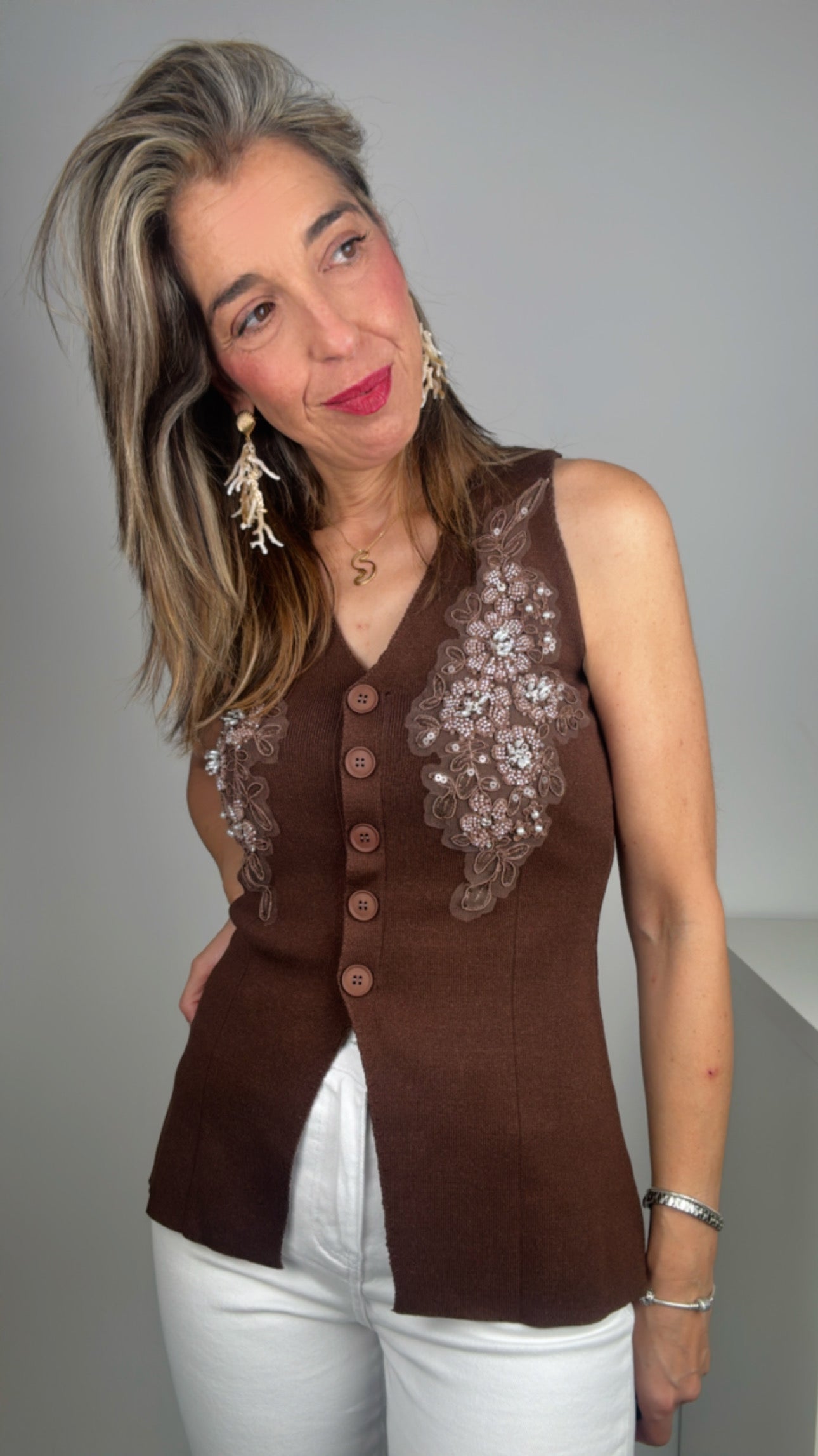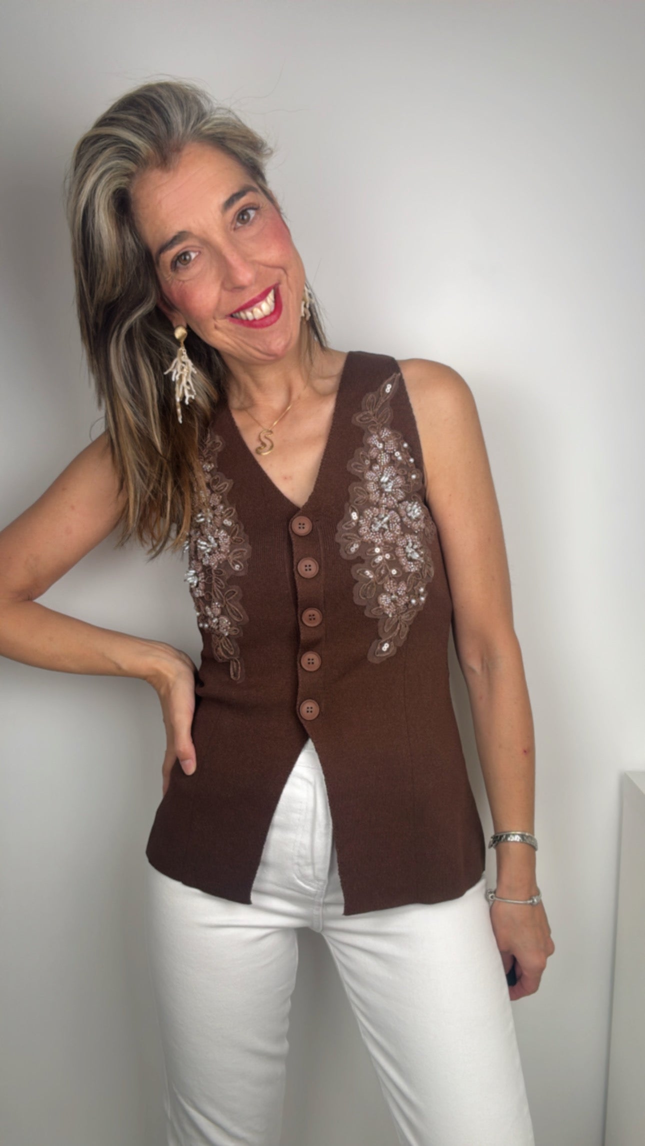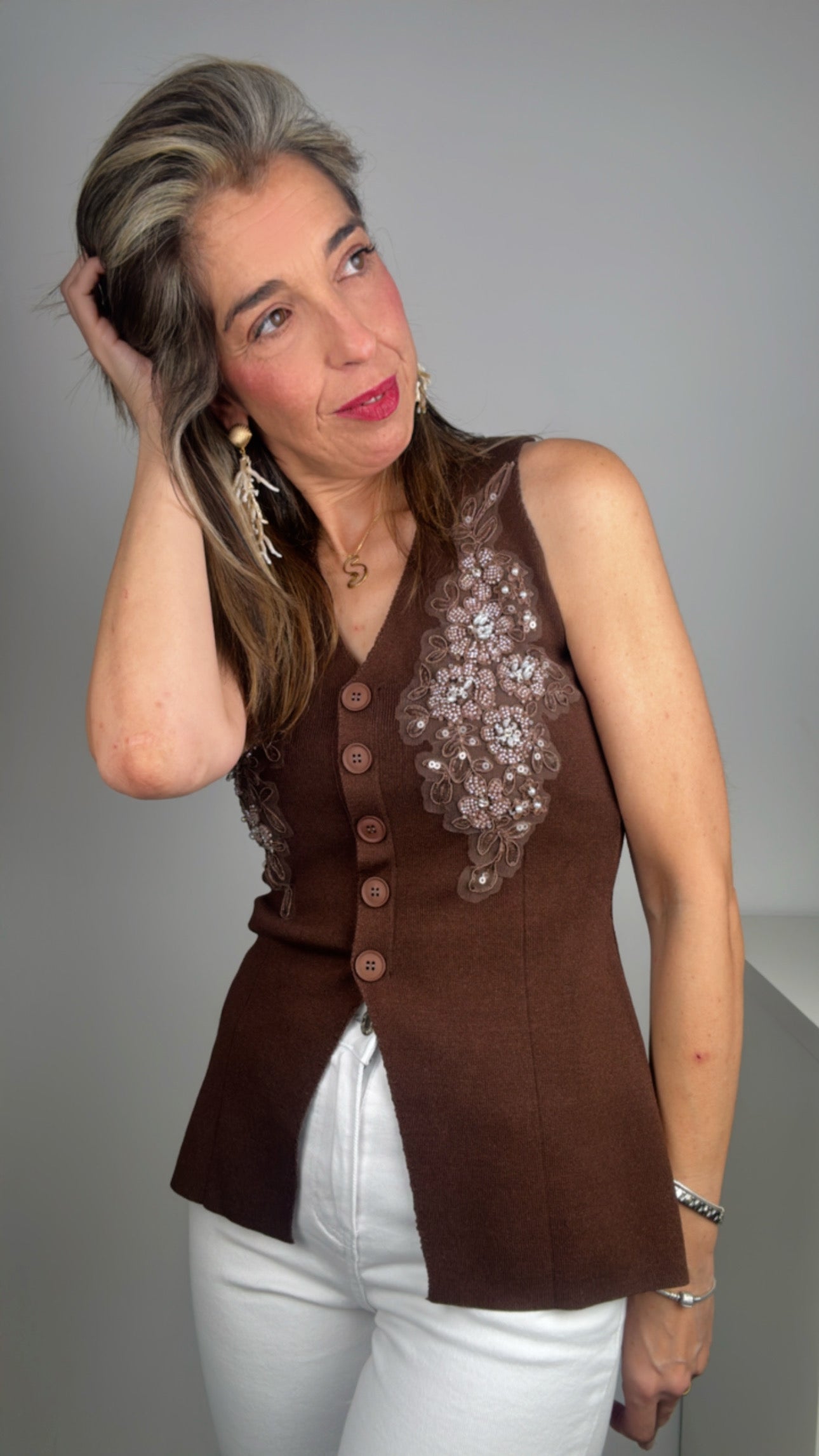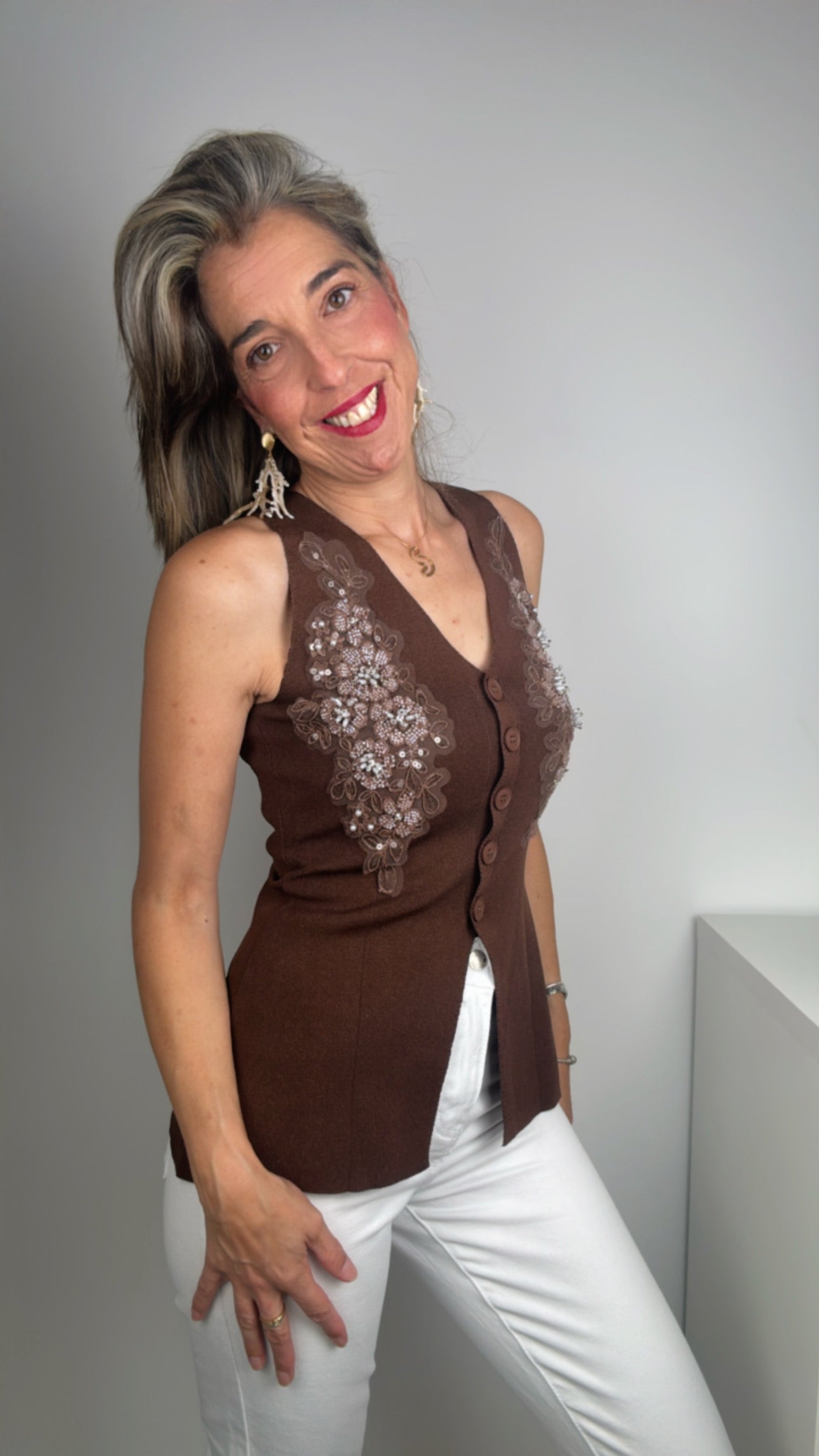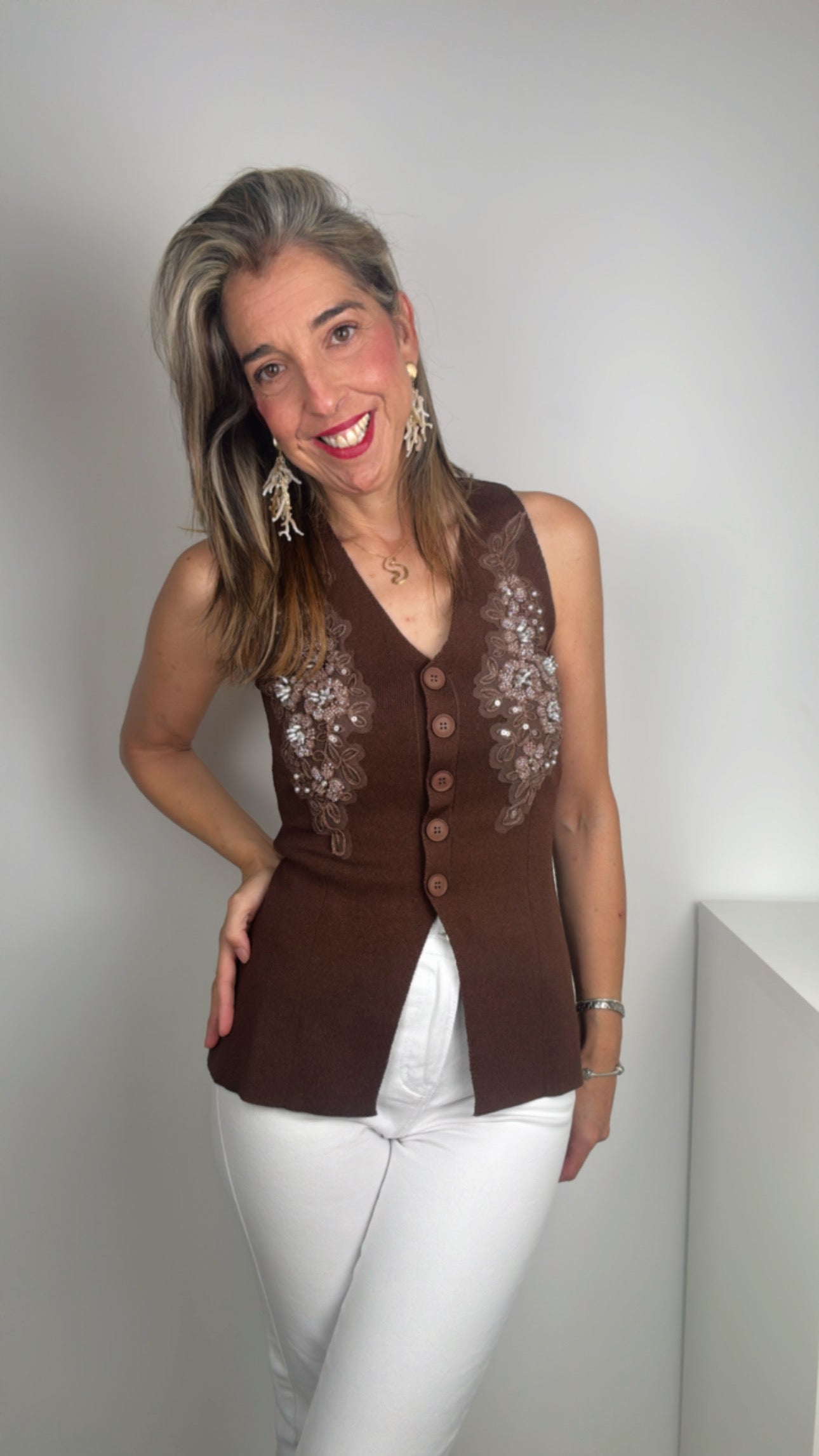 Pero lo que realmente hace único al chaleco Armonía son sus bordados florales decorados con pedrería y strass. ¡Una auténtica joya en forma de prenda! Cada detalle está pensado para aportar luz, estilo y personalidad, convirtiéndolo en una pieza estrella en tu armario.