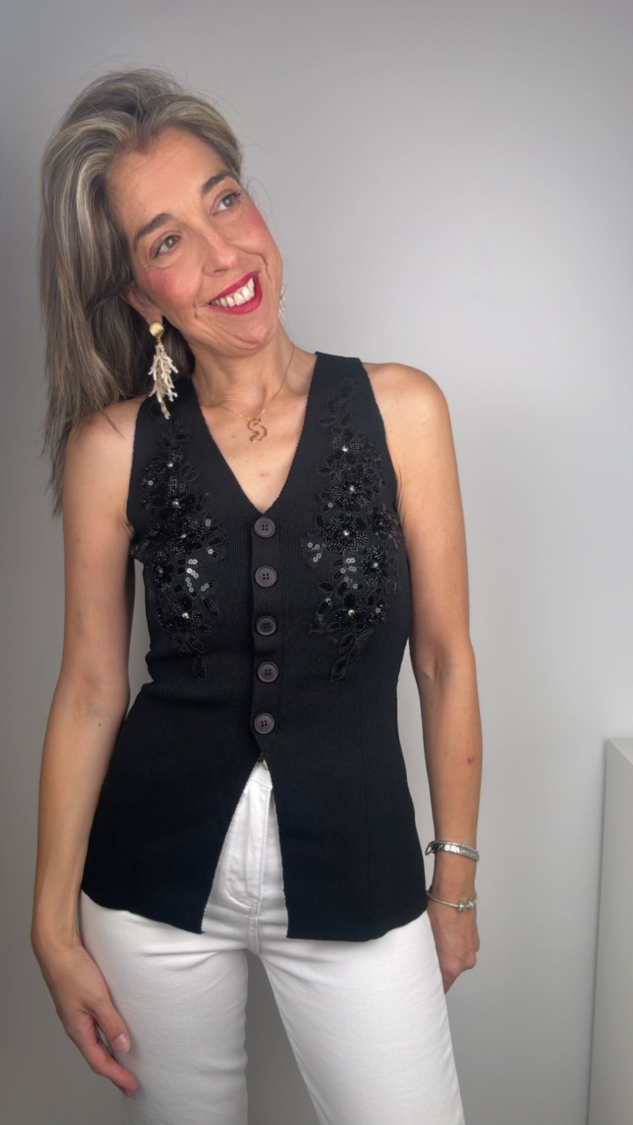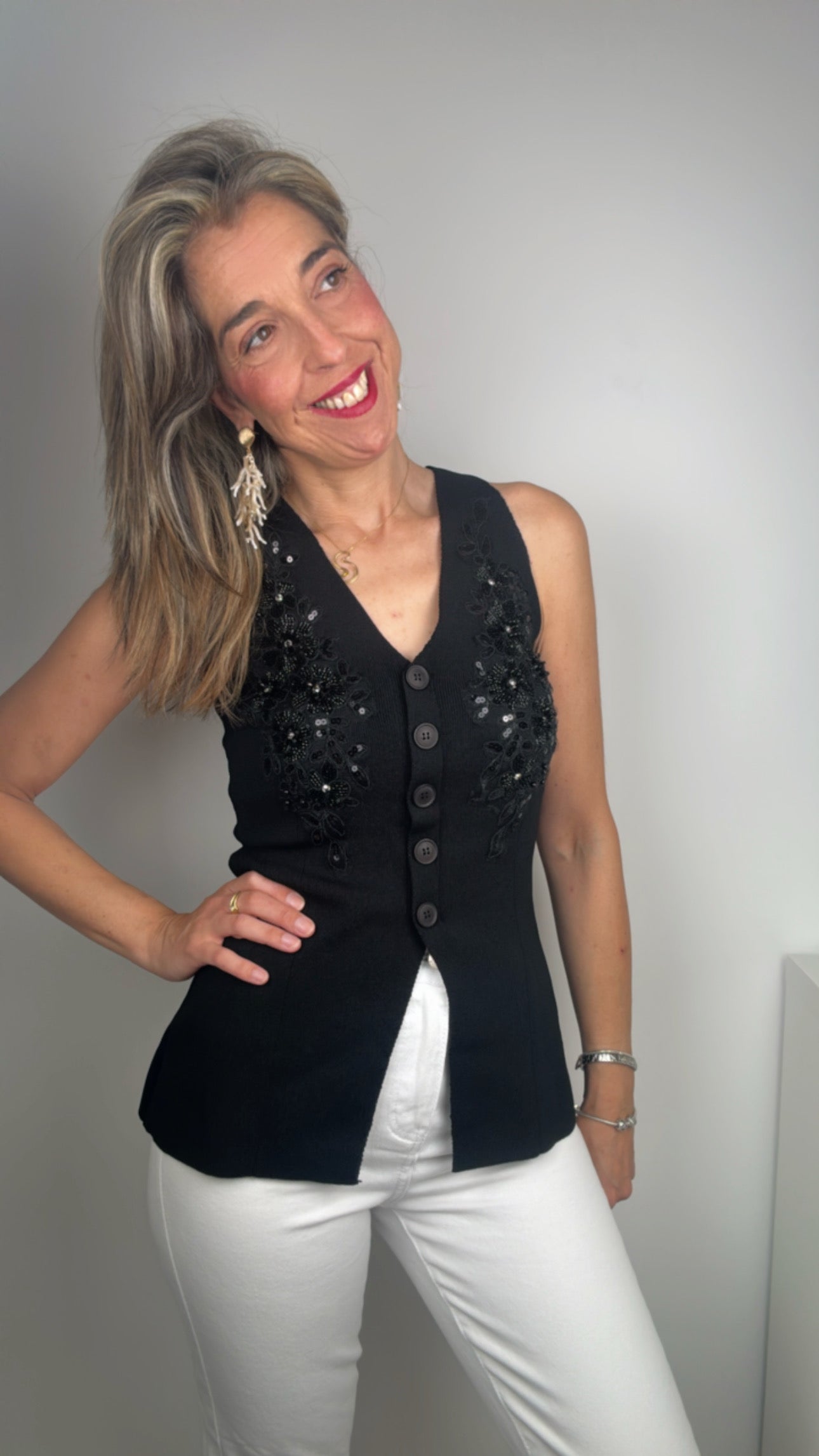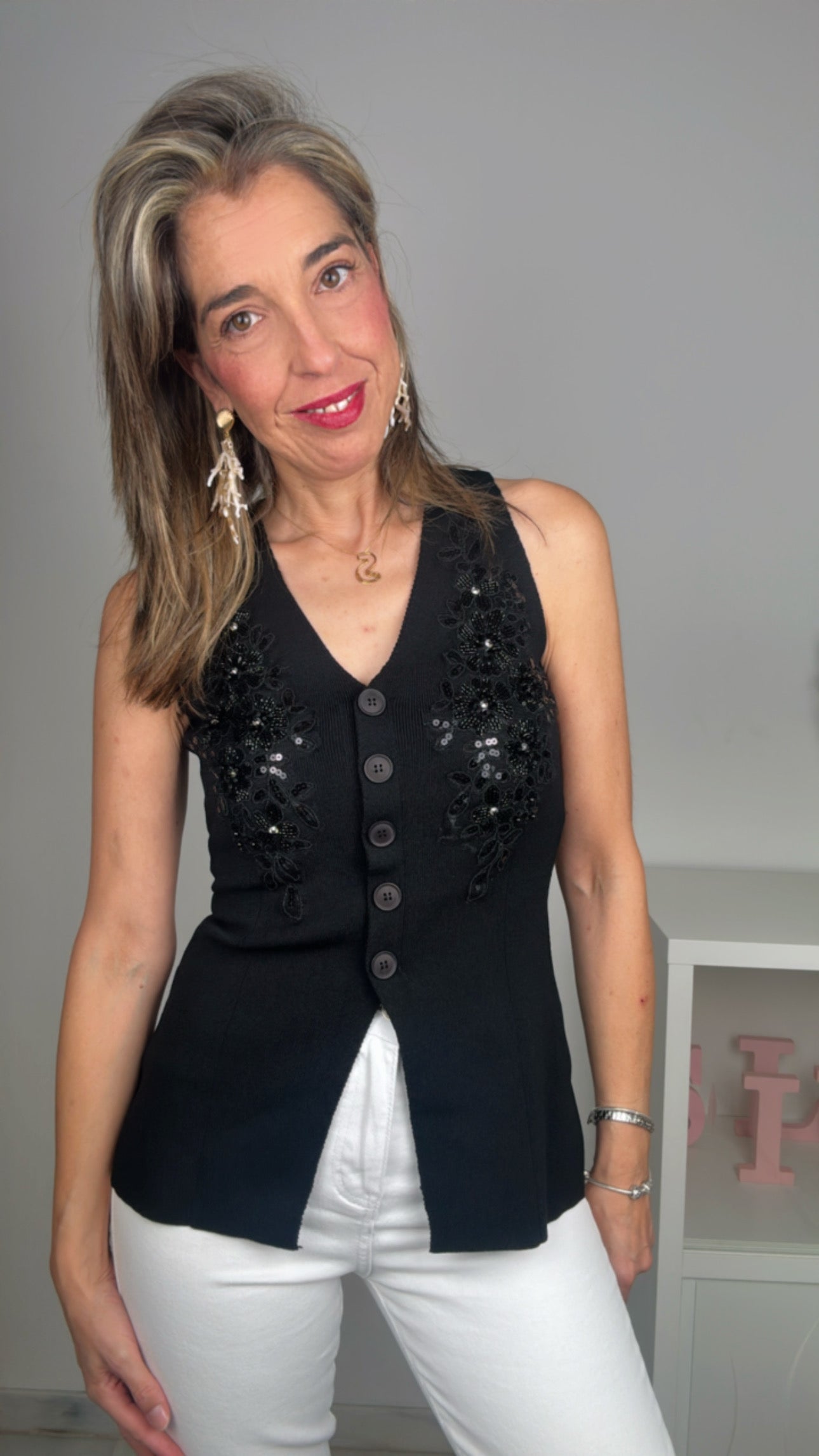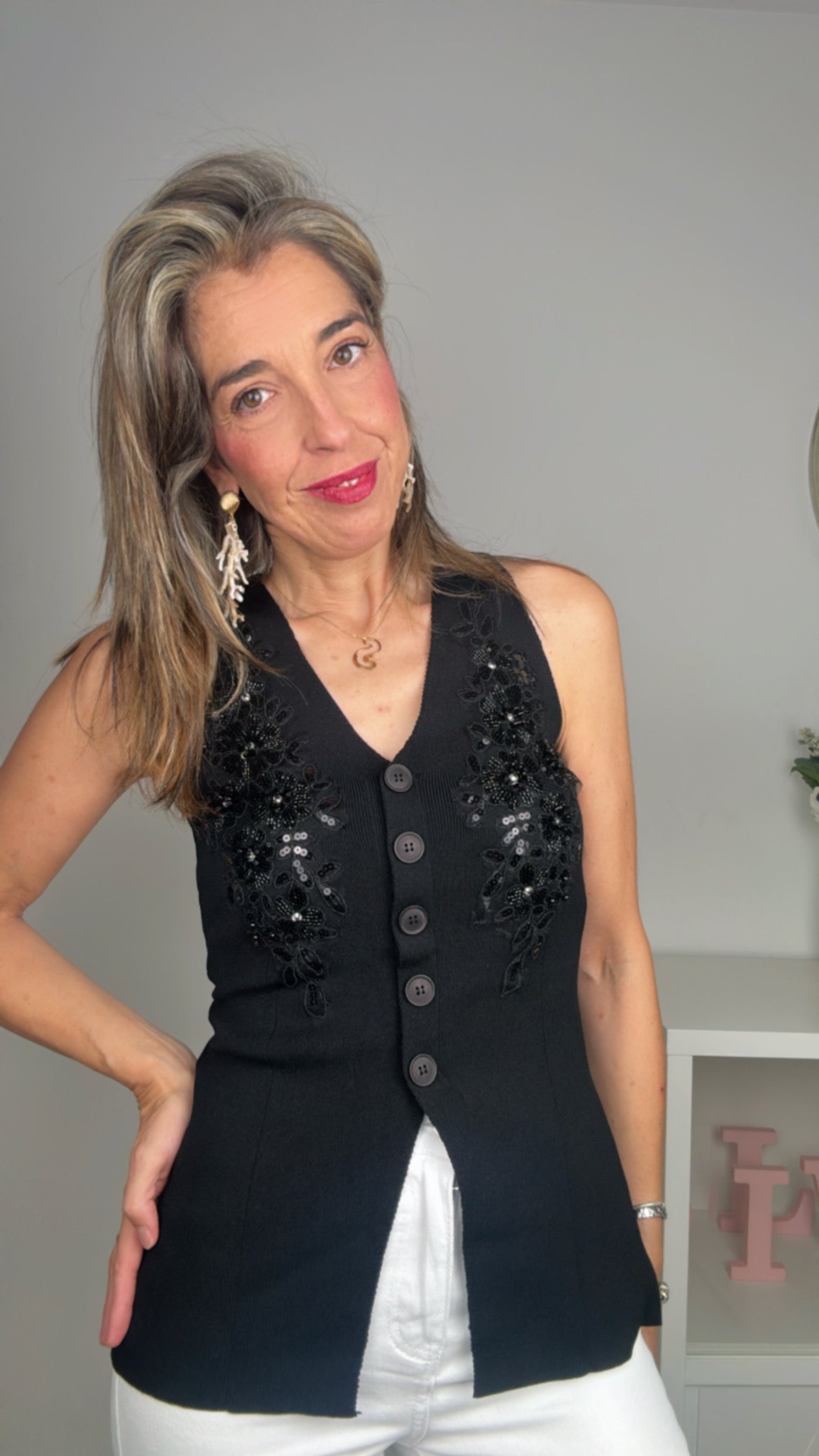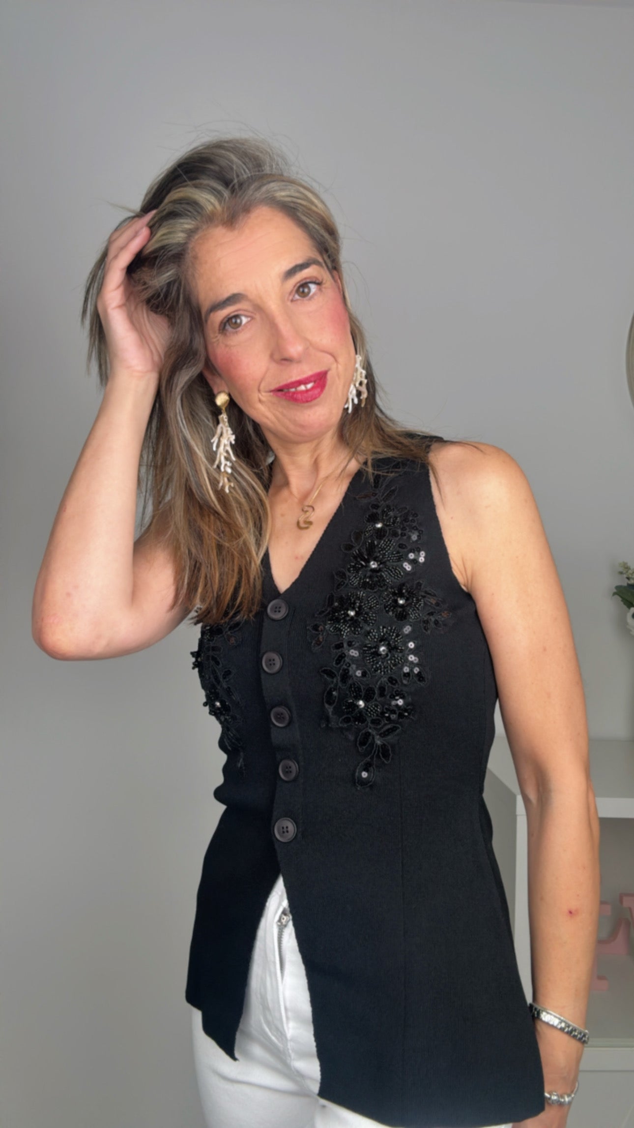Pero lo que realmente hace único al chaleco Armonía son sus bordados florales decorados con pedrería y strass. ¡Una auténtica joya en forma de prenda! Cada detalle está pensado para aportar luz, estilo y personalidad, convirtiéndolo en una pieza estrella en tu armario.