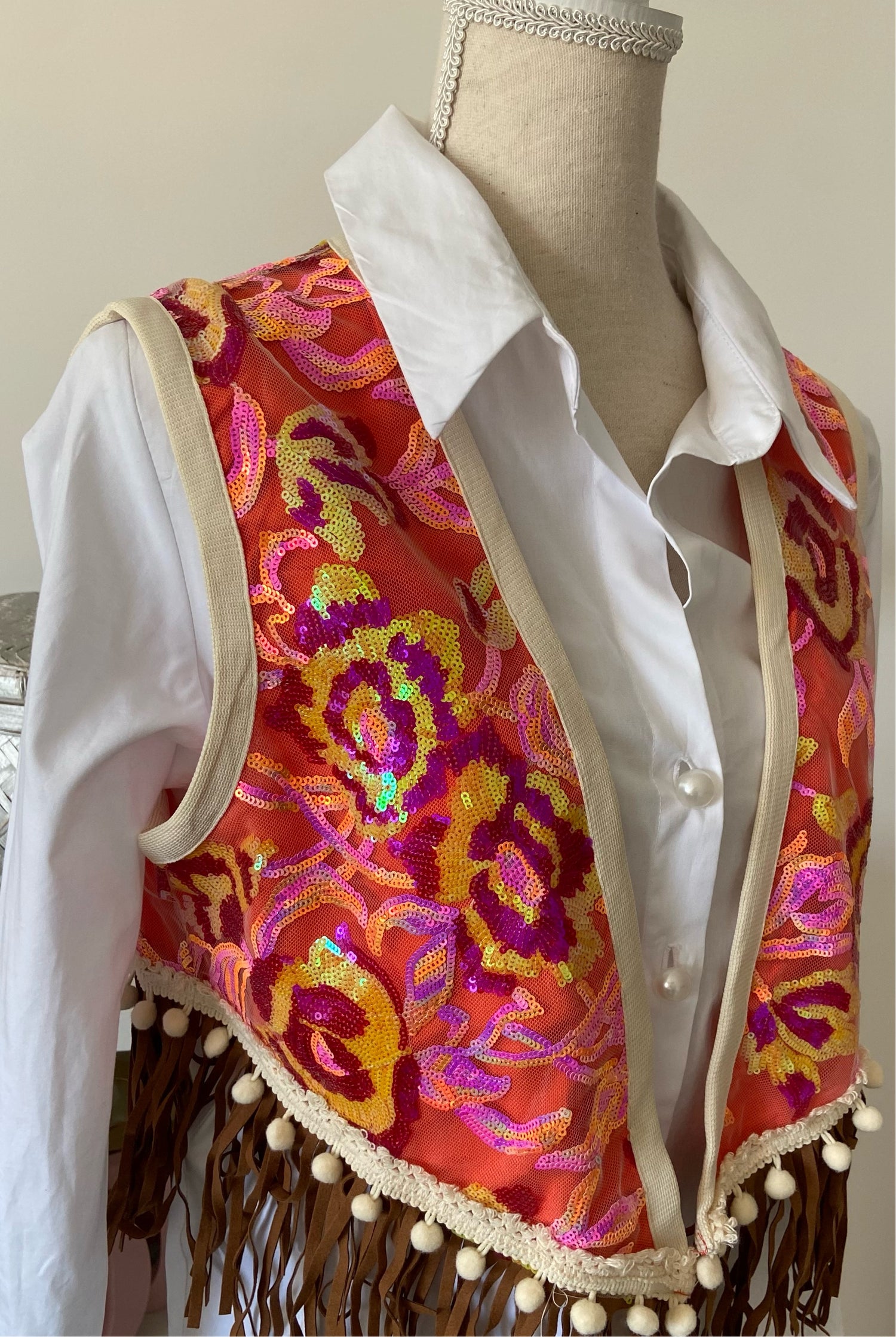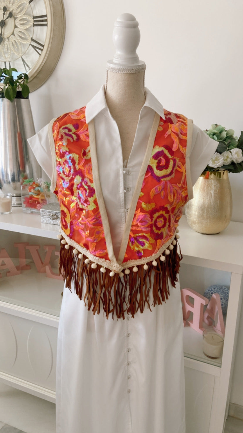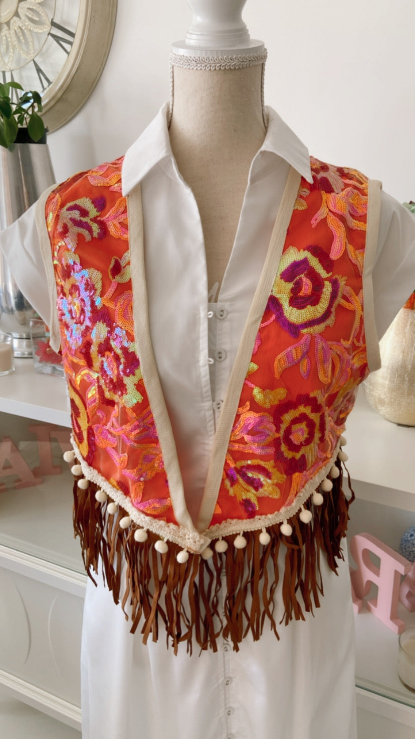 Chaleco abierto con bordado de lentejuelas y acabado en flecos.