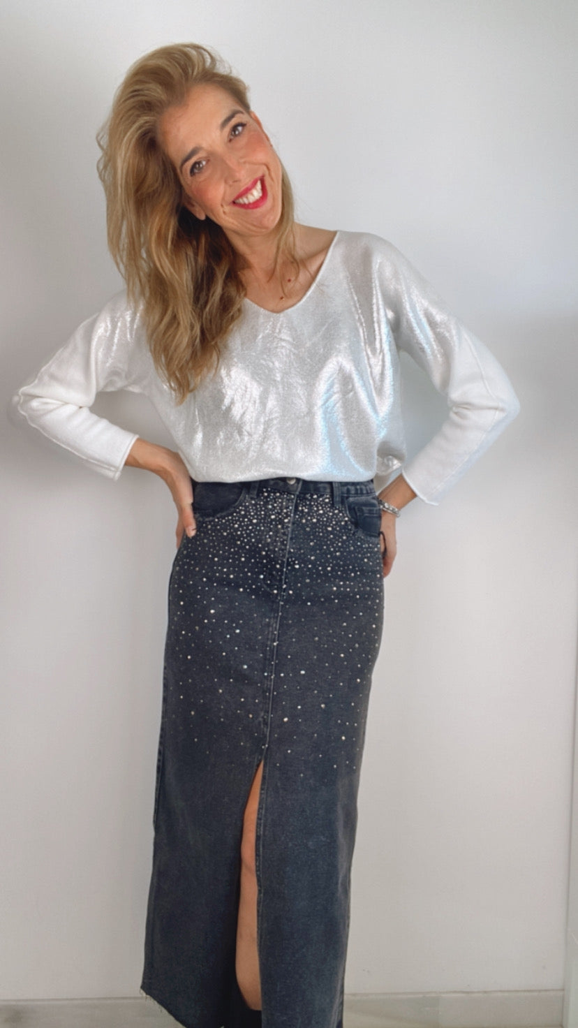 Falda midi en Denim negro con Strass desde cintura a cadera en la parte delantera.