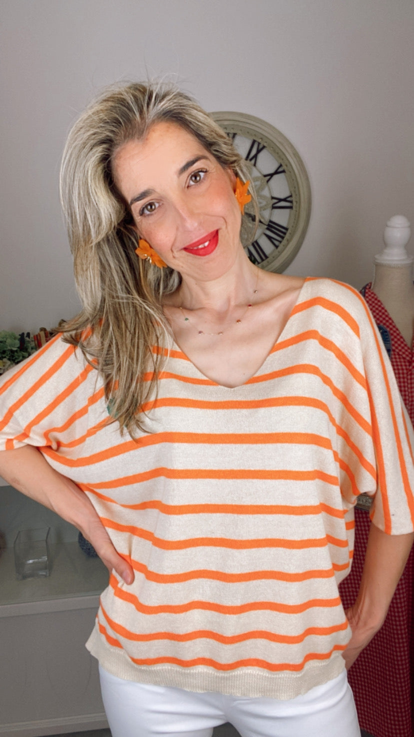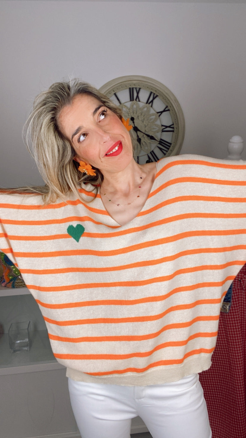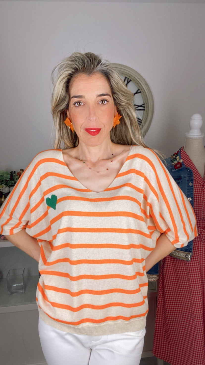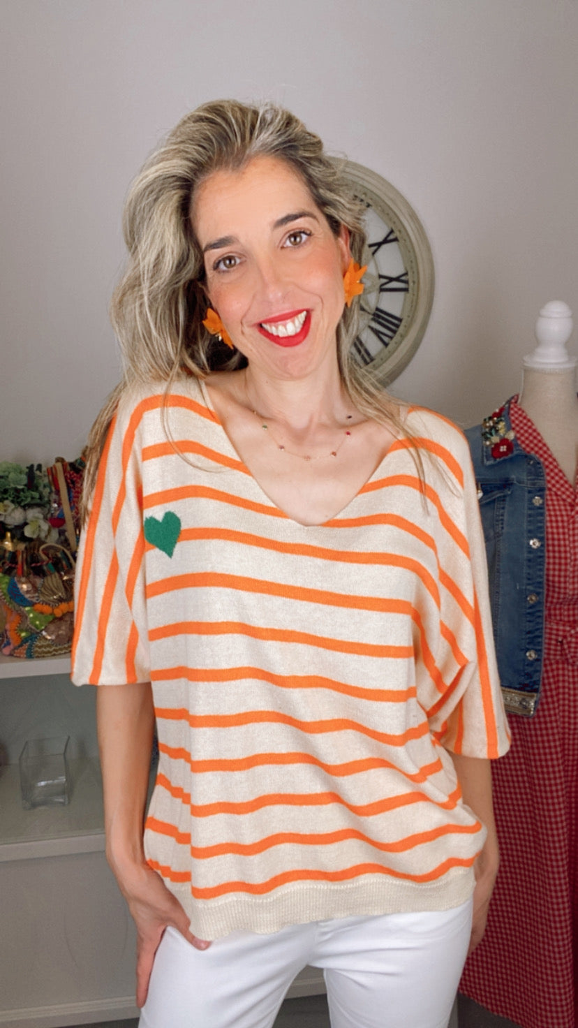 Jersey de hilo fino manga corta. Estampado de rayas naranjas y corazones verde.